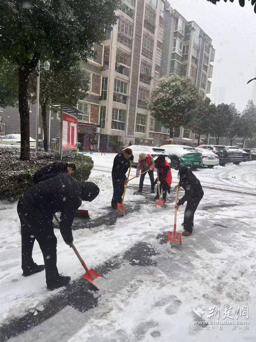 同一时段,各派出所的“扫雪大军”正在社区集结。纸坊所民警王新与“红马甲”志愿者们挥舞铁锹,在齐心社区的积雪中开辟出便民通道;庙山所民警汤莉芳带领辅警联合物业,穿梭在小区内,铁锹撞击地面的清脆声响与居民的道谢声交织在一起。