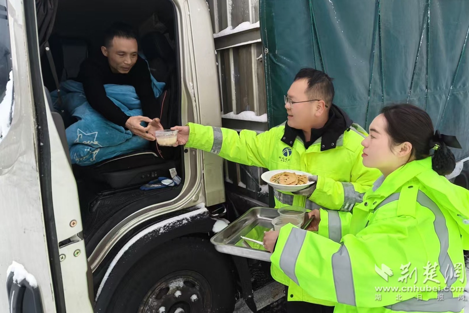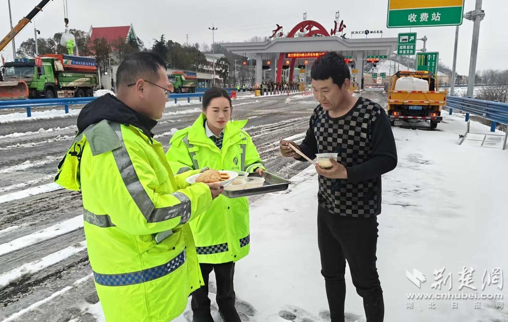 荆楚网(湖北日报网)讯(通讯员杨世奇)1月20日,受强冷空气影响,湖北京港澳高速大悟北路段近日出现降雪结冰天气,导致部分车辆滞留在收费广场。大悟北收费站迅速启动应急服务,为滞留人员送去食物与关怀。