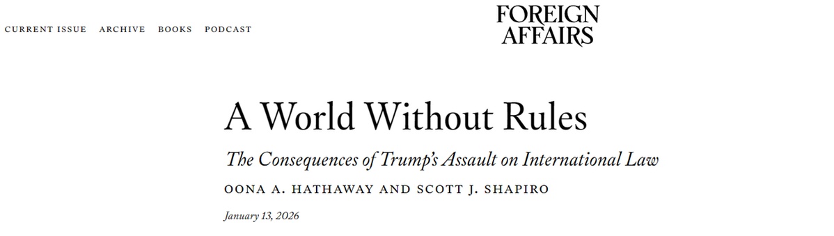 中国日报网1月21日电 本月初,美军对委内瑞拉发动大规模军事打击,强行控制委内瑞拉总统马杜罗夫妇并将他们带到美国。耶鲁大学法学院教授奥娜·哈撒韦(Oona A. Hathaway)和斯科特·夏皮罗(Scott J. Shapiro)在《外交事务》杂志网站撰文指出,美国这场未经联合国安理会授权、未经国会批准、不以自卫为由、甚至缺乏合理法律依据的军事行动,是对基于规则的国际秩序迄今最严重的破坏。