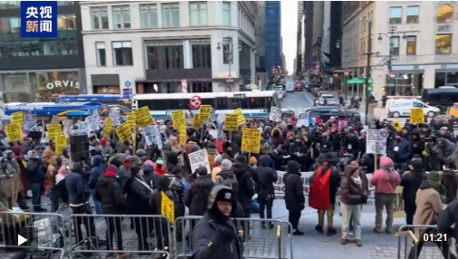 央视记者 徐德智:现在纽约的气温是零下7摄氏度,但是我身后仍有数百人而且是越来越多的人聚集在纽约公共图书馆前,表达对本届美国政府系列政策的不满。这些政策既包括移民执法局在内的国内政策,也包括美国政府一系列违反国际法的行为。他们希望本届美国政府可以更多聚焦在民生、教育、医疗等一系列民众关心的问题上面。