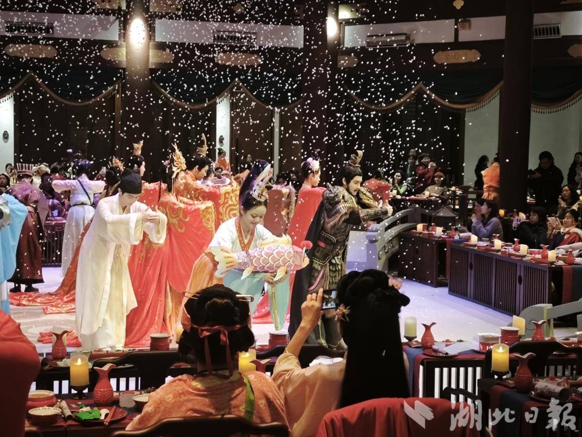 “市集上有飞花令、投壶射箭等活动,赢得的钱币还能兑换奖品,从布景到演员都格外细致,沉浸感很强。”湖北归梦廊汉服社成员华歌特意身着古装前来体验,“晚餐精致,氛围十足,边吃边看边互动,体验非常新奇。”