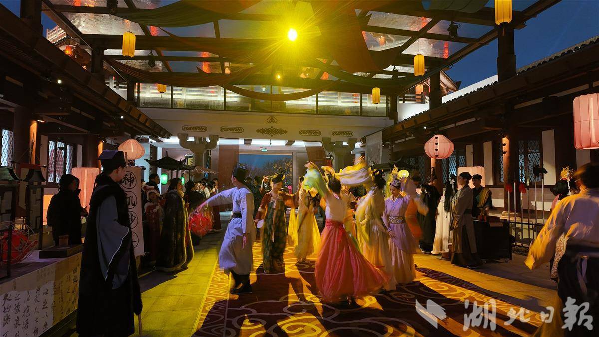 游客通过“知音文化旅游区”小程序成功预约后,即可步入知音殿内。在这里,张飞、黄月英、华佗等角色发出“切磋”邀请,还有三国市集、趣味解谜等游戏。傍晚五点半,古装舞剧准时开演。演出以“知音”为主题,精心呈现《连环计》《赤壁之战》《文姬归汉》等五幕大戏,聚焦不同英雄人物的知己际遇与家国情怀,全程约两小时。随着剧情推进,工作人员还会奉上对应桥段的楚菜美肴,游客一边品味晚餐,一边欣赏演出,体验视觉和味觉的双重享受。