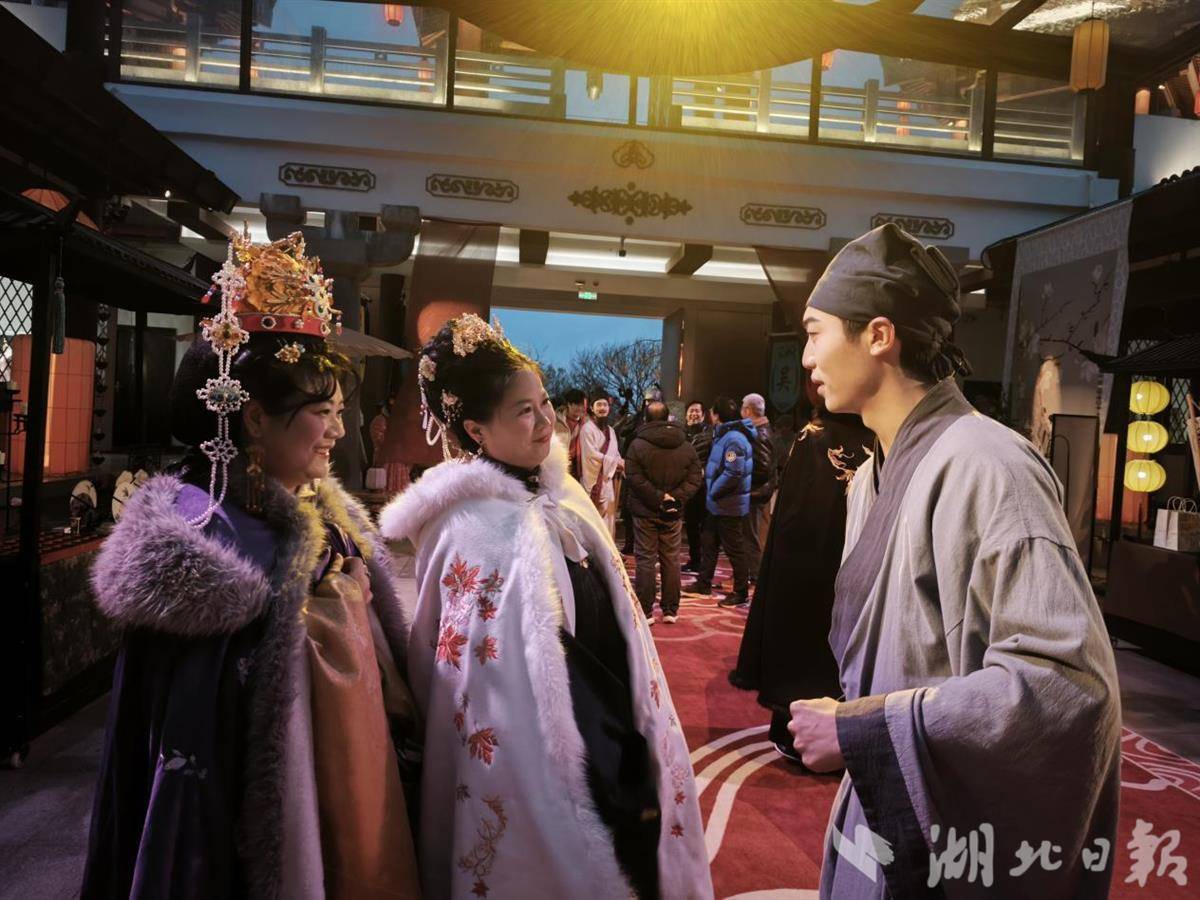 本周起,知音殿一层沉浸式剧游空间正式开放预约,吸引众多游客冒雪前来。核心项目“三国群芳宴”以三国文化为脉络,巧妙融合剧情互动、主题舞剧与楚菜餐饮为一体的独特餐秀体验。