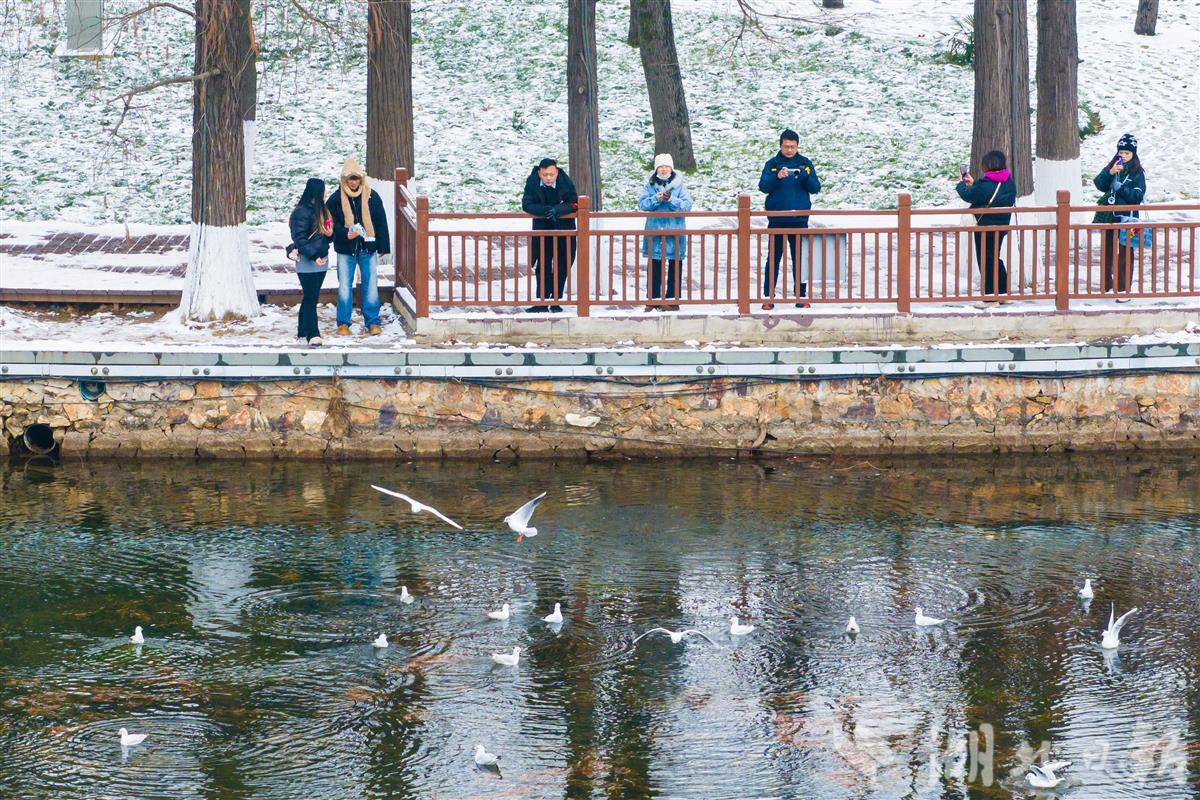 1月21日,在武汉东湖听涛景区,游客们尽情欣赏雪景,并与红嘴鸥进行互动。这些“白色精灵”低空盘旋、俯冲捕食,时而停在岸边、时而掠过水面,成为了一道独特的风景线。(湖北日报全媒记者 任勇 摄)