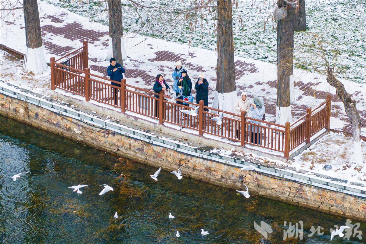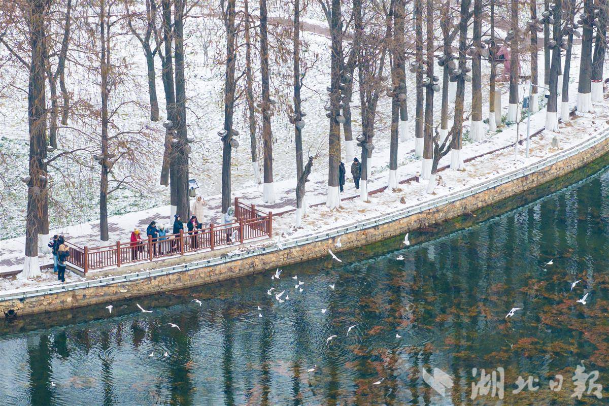 1月21日,在武汉东湖听涛景区,游客们尽情欣赏雪景,并与红嘴鸥进行互动。(湖北日报全媒记者 任勇 摄)