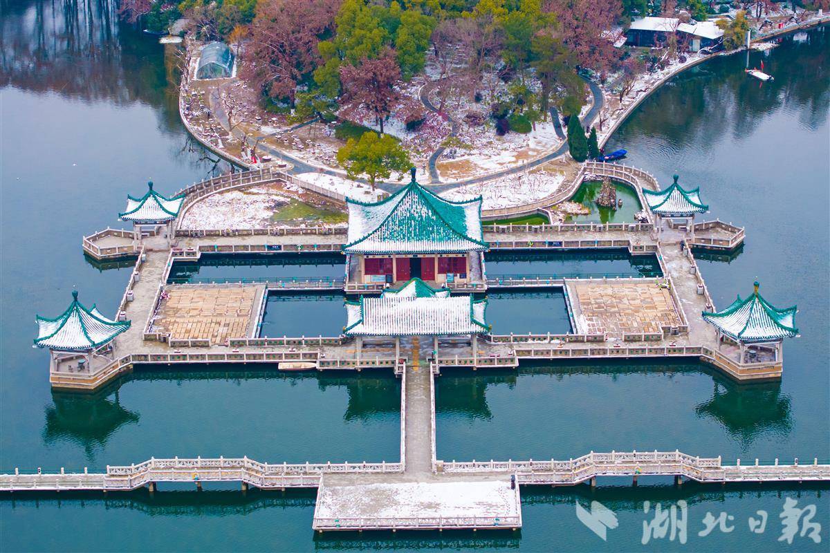 1月21日,武汉东湖碧潭观鱼的水墨亭台在雪景中别具韵味。(湖北日报全媒记者 任勇 摄)