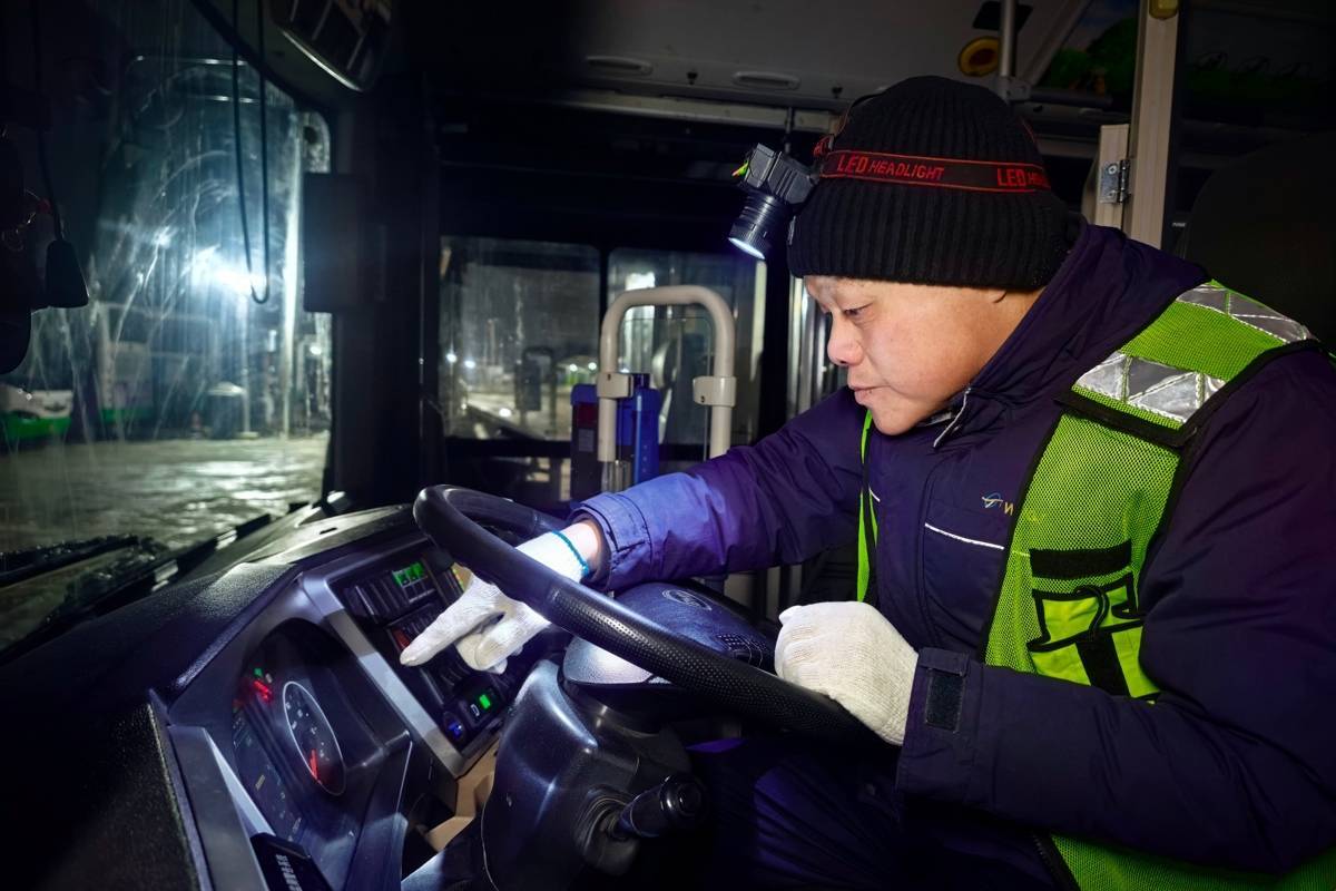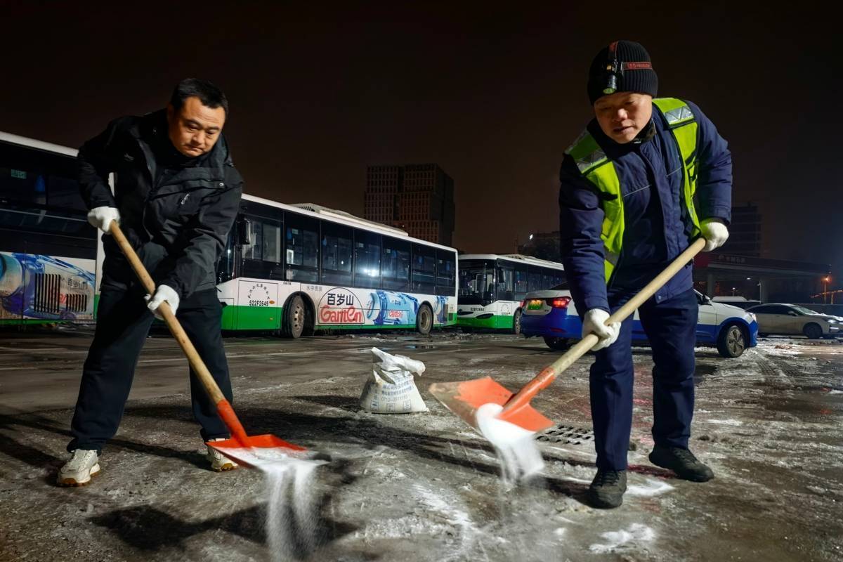 除了充电本职,冰冻天气还带来了“附加题”。他拎着融雪剂,在场站弯道处泼洒,防止车辆打滑;仔细检查每辆车的前后门踏板,撒上融雪剂以防乘客滑倒;轻轻抬起每辆车的雨刮片,防止它们与挡风玻璃冻在一起。“这些细节看着小,却关系到安全和准点。”方承华说。
