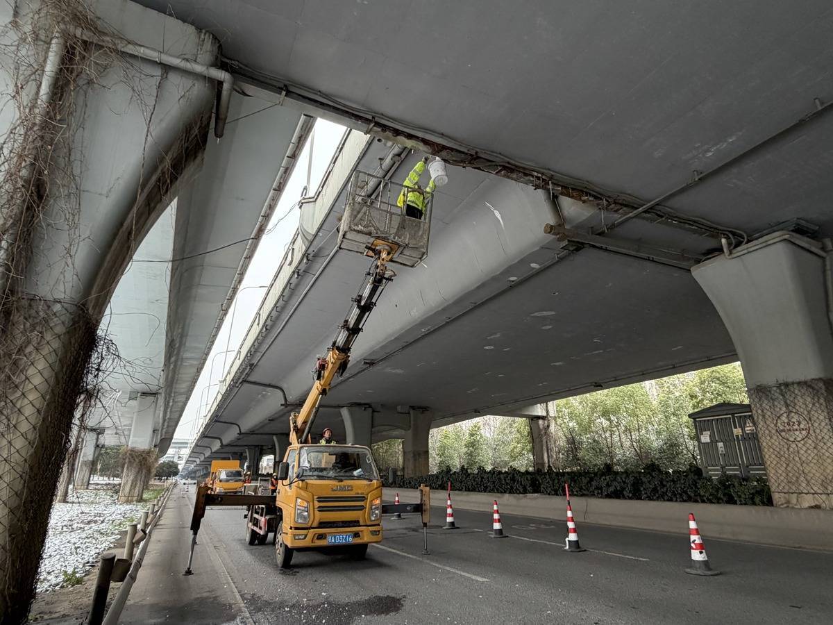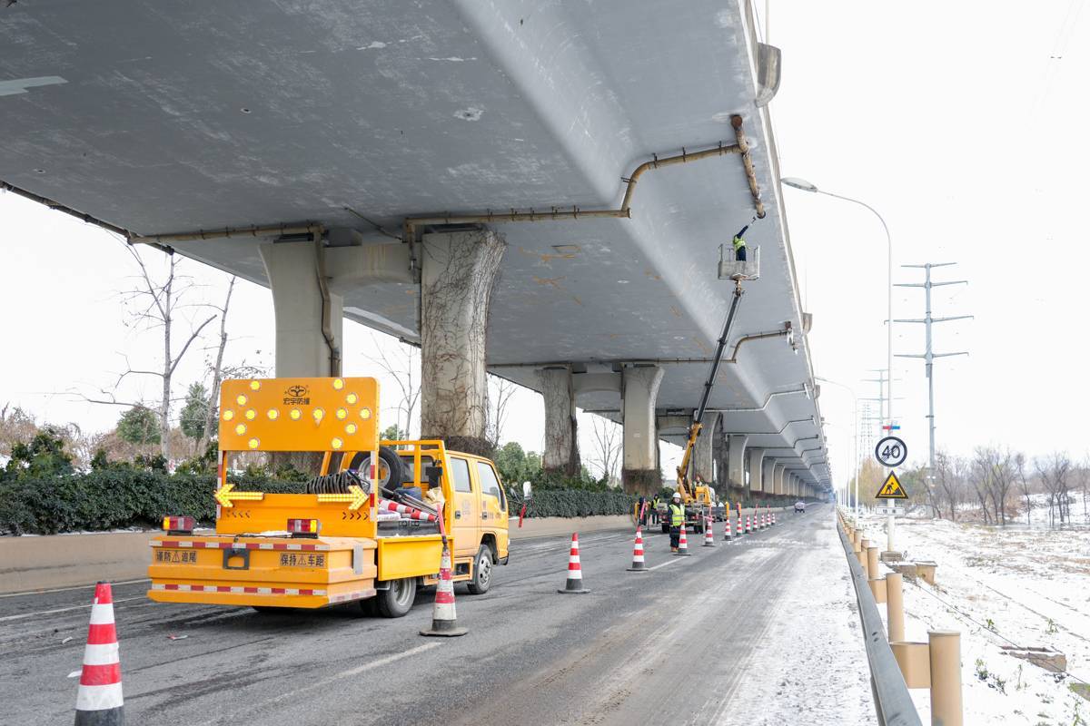 管养人员顶风冒雪,高效协作,采用登高车、伸缩除冰杆、伸缩抄网等设备,完成了长江二桥汉口岸黄浦立交、岳家嘴立交、航空路立交、武胜路高架、汉口站地下通道等桥隧的清除作业。经排查,全市城市桥隧总体安全畅通,市民可放心通行。