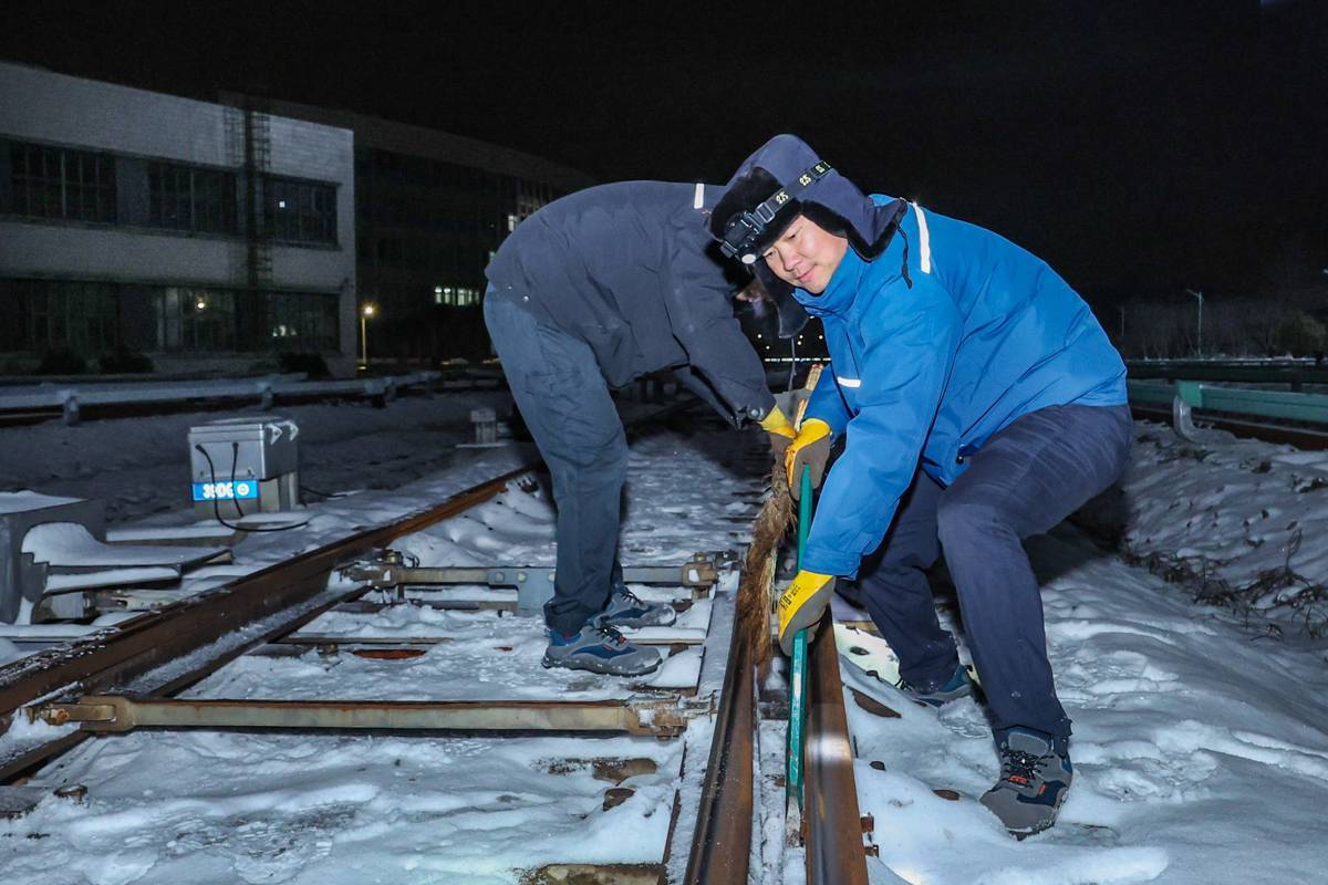 打开头灯,胡海峰用大扫帚扫除表面积雪,用铁锹铲除表面冰渣;熊丰蹲下身,双手握住小工兵铲,仔细清除尖轨与基本轨之间的碎冰,细小的夹缝也不放过。清理完碎冰确认区域无异物后,他对滑床板等零部件上涂抹防冻油。在灯光映照下,大家呼出的白气清晰可见;不过片刻,手套边缘悄然结了一层薄霜。