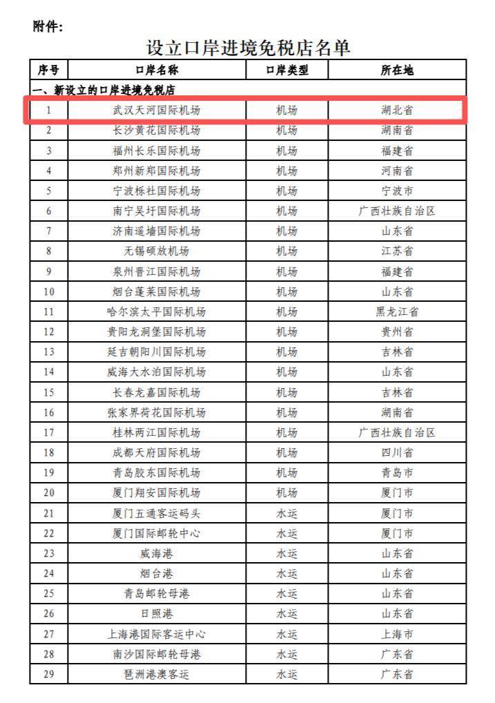 湖北日报讯(记者李朝霞、通讯员沈商轩)1月21日,财政部、商务部、文化和旅游部、海关总署、税务总局联合印发《关于口岸进境免税店有关事宜的通知》(以下简称《通知》),设立调整一批口岸进境免税店。