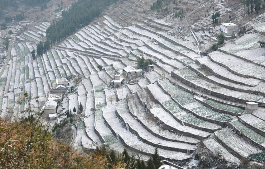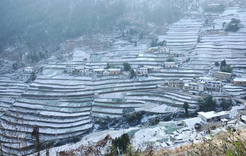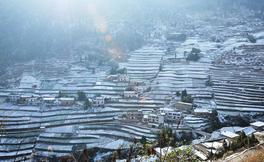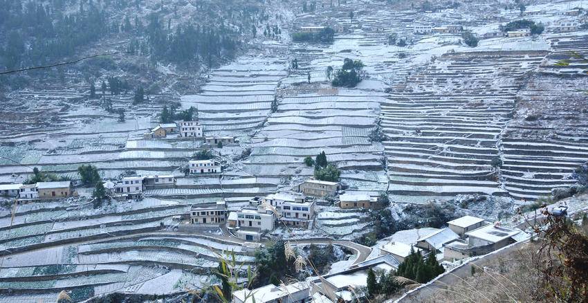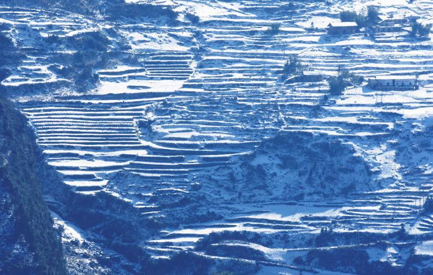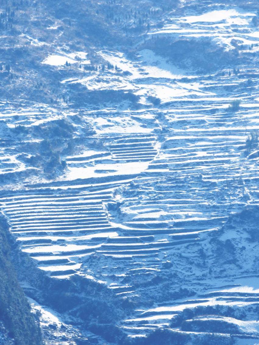 放眼望去,山坡上的玉树银花,像盎然怒放的雪莲花。错落有致的梯田白茫茫的一片,像是披了件白色外套或是铺上巨型绒毯,好像整个田园是用白银装饰而成的。雪后,层层叠叠的梯田琼枝玉叶,粉装玉砌,皓然一色,仿佛要将人们带入童话世界和人间仙境,期盼马年丰收的喜人景象。