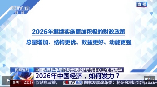 中国财政科学研究院宏观经济研究中心主任 石英华:总量增加、结构更优、效益更好、动能更强这四个关键词,实际上是进一步阐释了中央经济工作会议明确了2026年继续实施更加积极的财政政策,可以说这四个词更生动地或者更明晰地表现了更加积极的财政政策。支出的总量只增不减,如果我们联系到2025年来看,2025年其实财政政策就实施了更加积极的政策,赤字率是4%,比2024年提高一个百分点。债务规模整体也较过去几年的水平明显提高。所以,在2025年的支出规模和赤字规模这个盘子上来看,今年保持支出的盘子继续扩大,整体支出保持必要的力度,而且也会持续地发力和更加地给力,能够在“十五五”开局之年提供有力支撑。