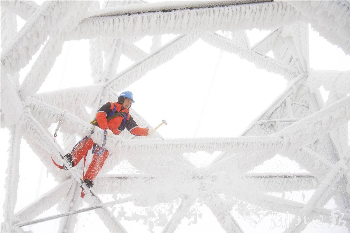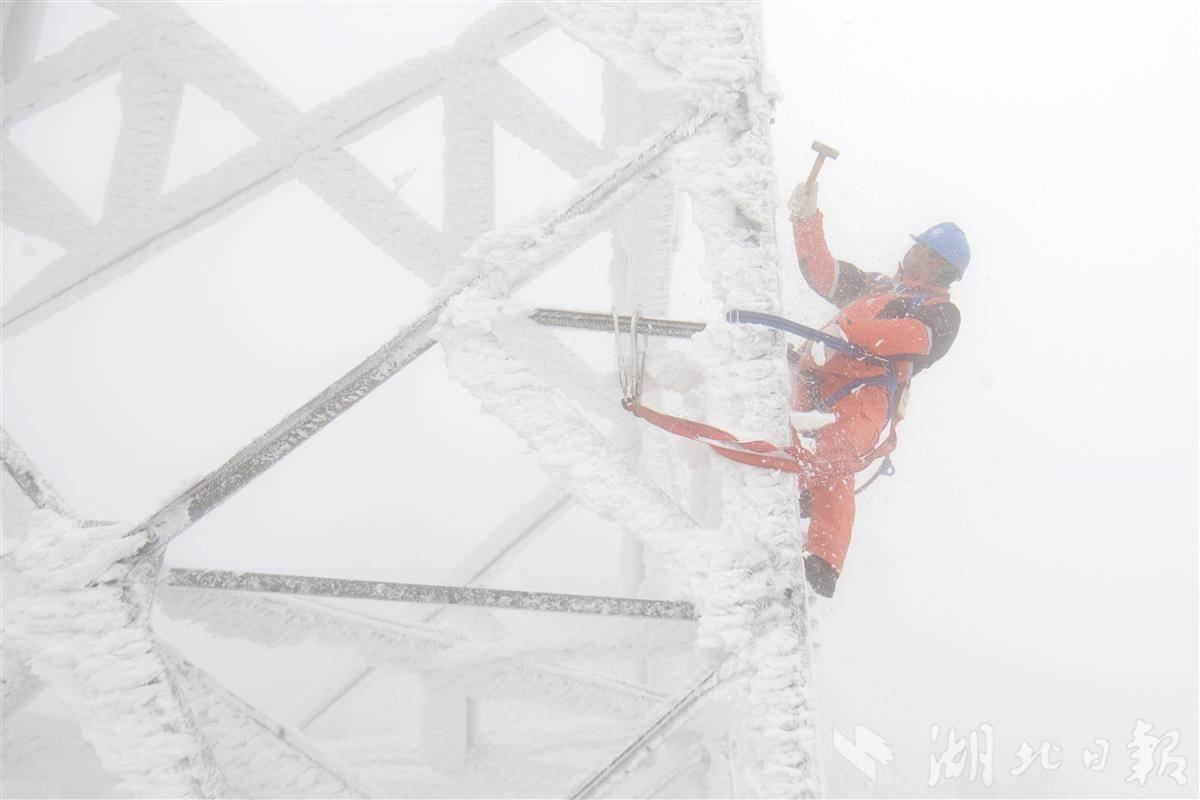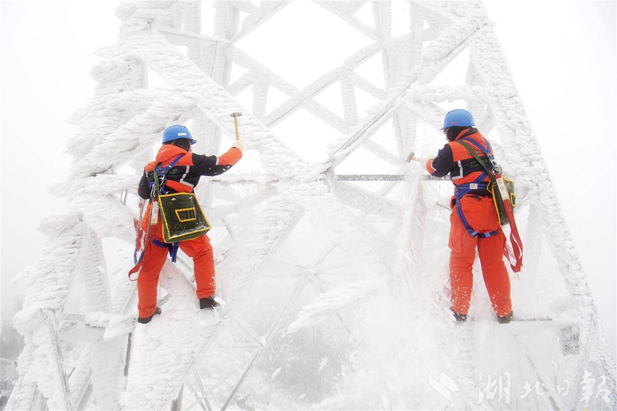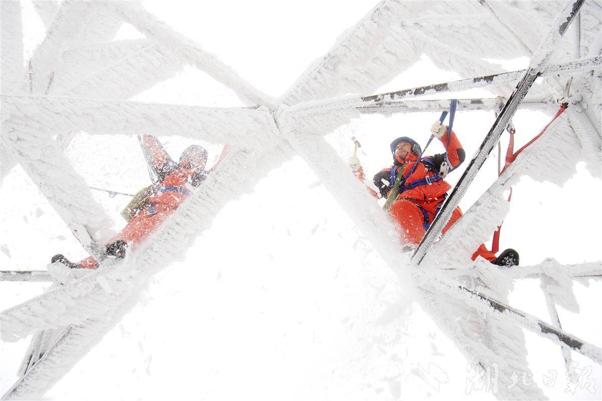 1月21日,抢修人员在鹤峰县走马镇35千伏电力线路铁塔进行除冰作业。