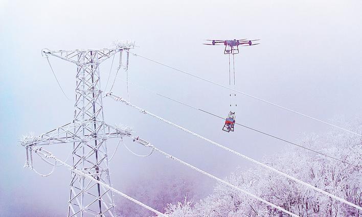 上图:无人机将完成作业的除冰机器人吊下110千伏翁天一回42—43号塔导线。