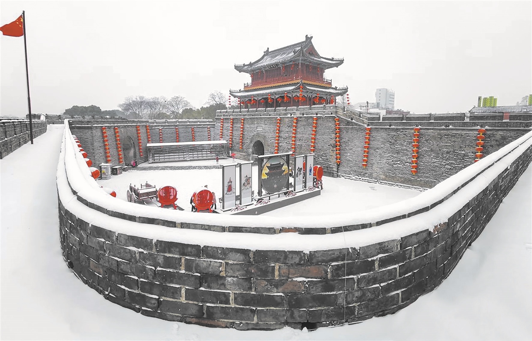 1月20日,雪落荆州。航拍镜头在雪中飞行,将焦点定格古城东门宾阳楼。11.28公里古城垣自此延展,青灰城砖被薄雪轻裹,砖缝间的岁月肌理在风雪中愈显苍劲,如银带般蜿蜒环抱东门盛景。