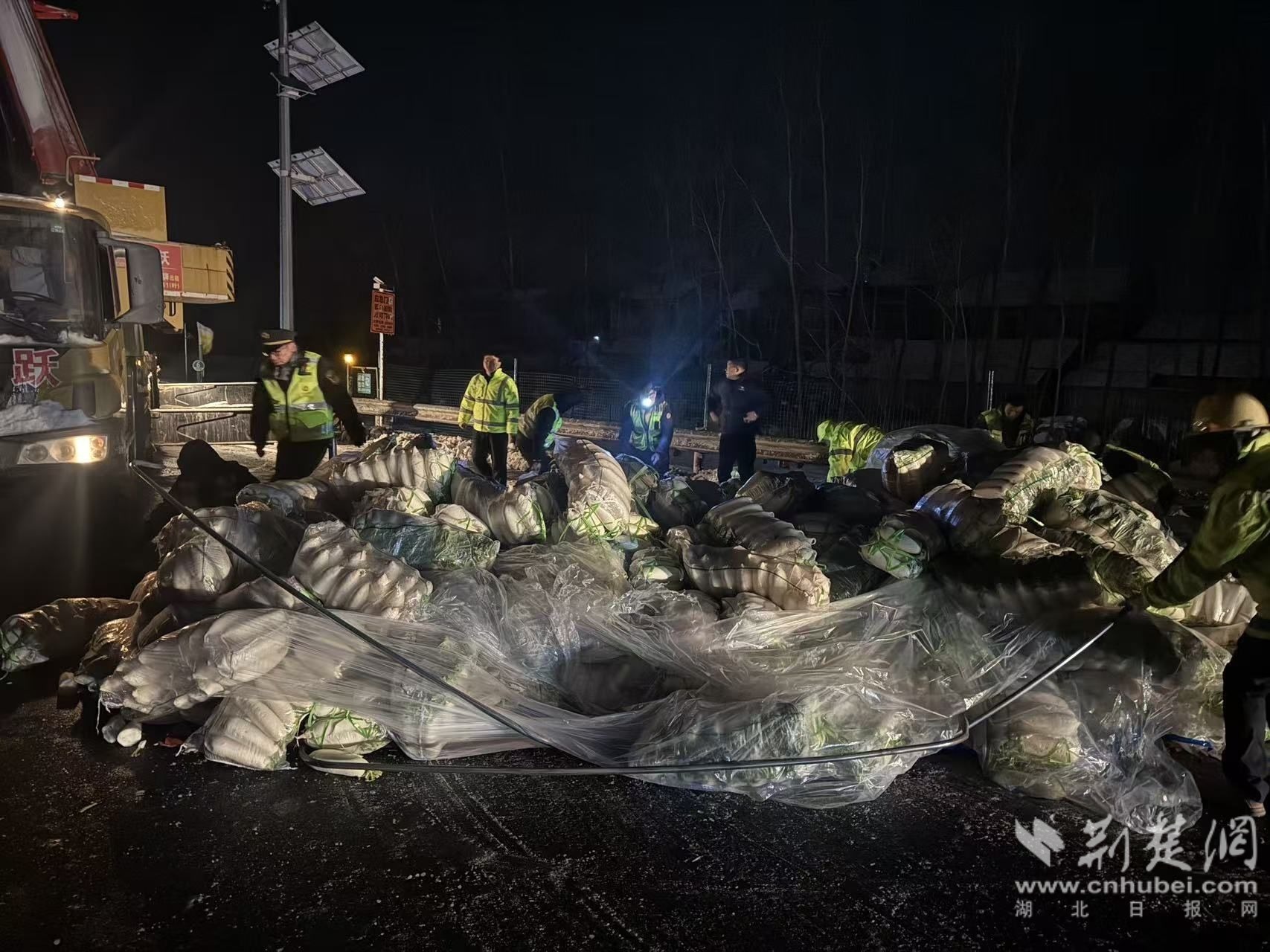 荆楚网(湖北日报网)讯(通讯员张杰)近日,省高速公路路政执法四支队二大队辖区沪渝高速汉宜段渝沪向K1008+700M处,一辆满载蔬菜的货车因车速过快侧翻,导致路段交通临时中断。路政执法人员顶风冒雪紧急处置,仅用不到两小时便抢通道路,获滞留司乘一致好评。