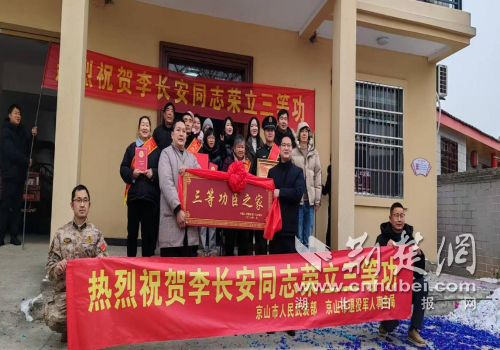 荆楚网(湖北日报网)讯(通讯员 高龙 陈枝英)1月21日,京山市人民武装部联合市退役军人事务局组成“送喜报小分队”走进绿林镇高枧村,将“三等功臣之家”的牌匾和喜报送到了现役军人李长安的家中。