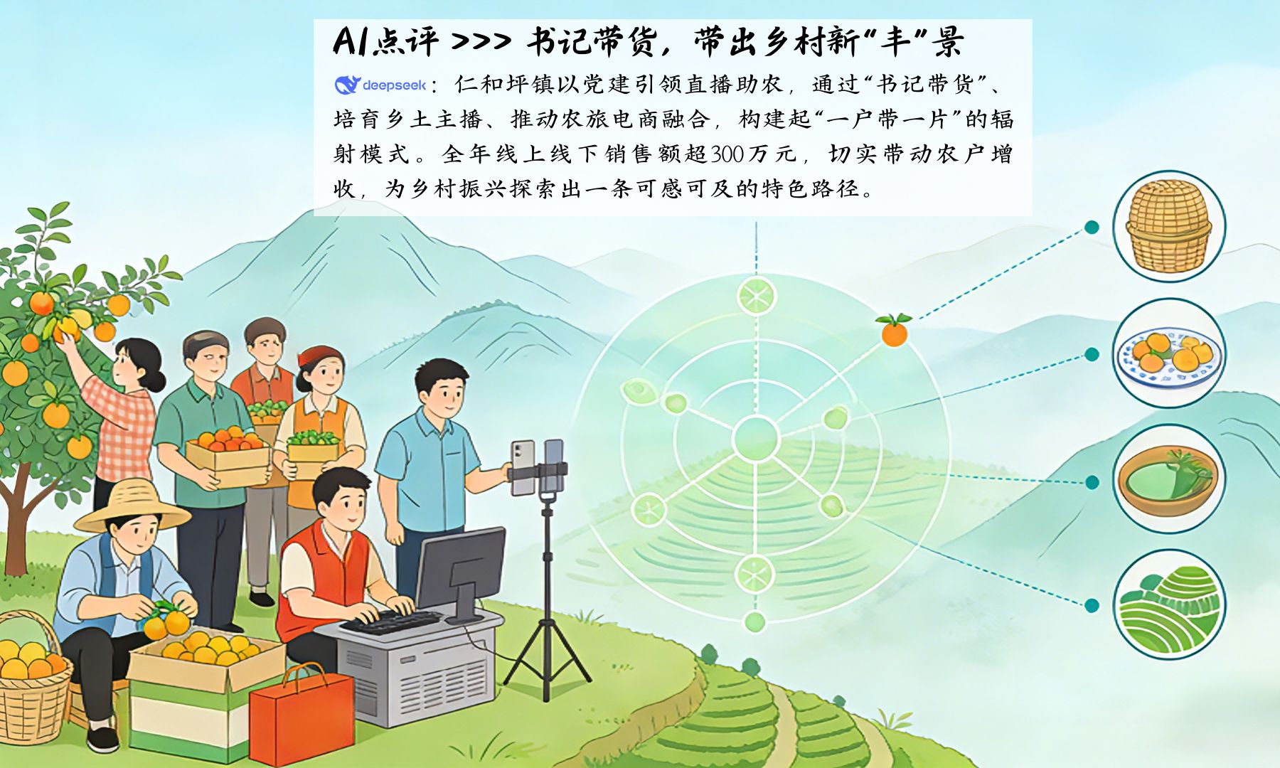 谁能想到,这位两年前还对直播一窍不通的“门外汉”,如今已成为乡亲们公认的“金牌推销员”之一。这一转变的背后,是仁和坪镇以党建为引领,构建起“镇党委+村党支部+党员示范户”三级联动机制,推出“书记带你购仁和”专项助农行动。各村党支部迅速响应,组建助农先锋队,村党支部书记、驻村第一书记带头担任“产销联络员”,全镇20余名“带货书记”应声上线,组团开启了直播带货。