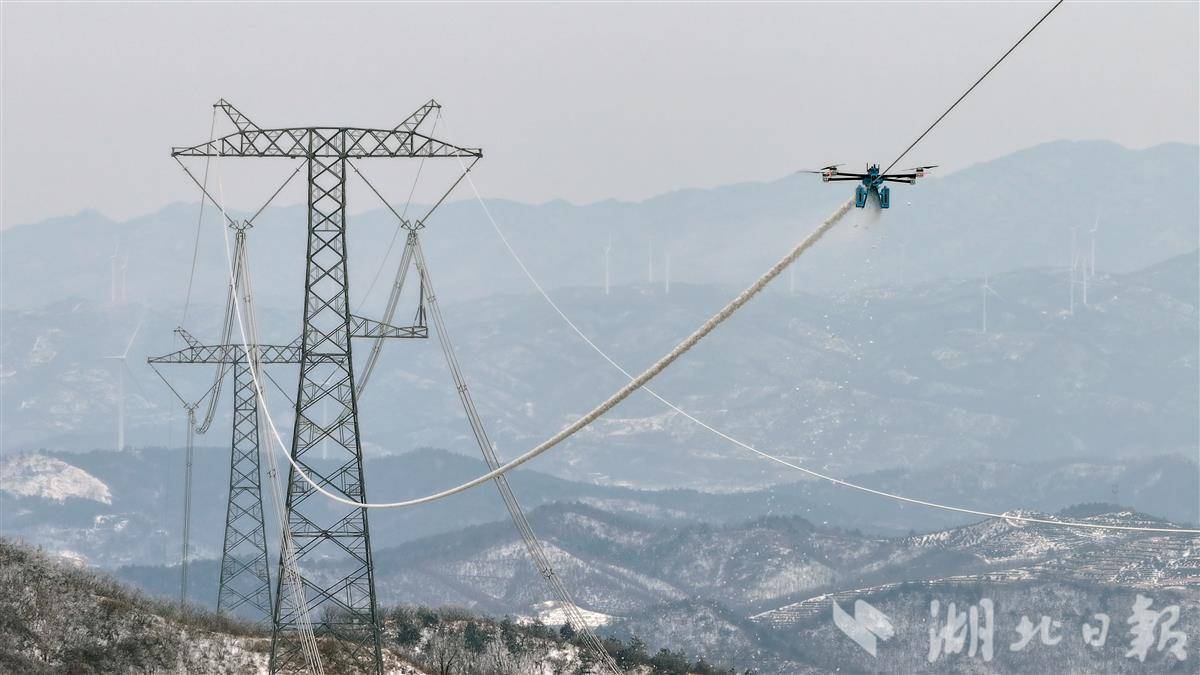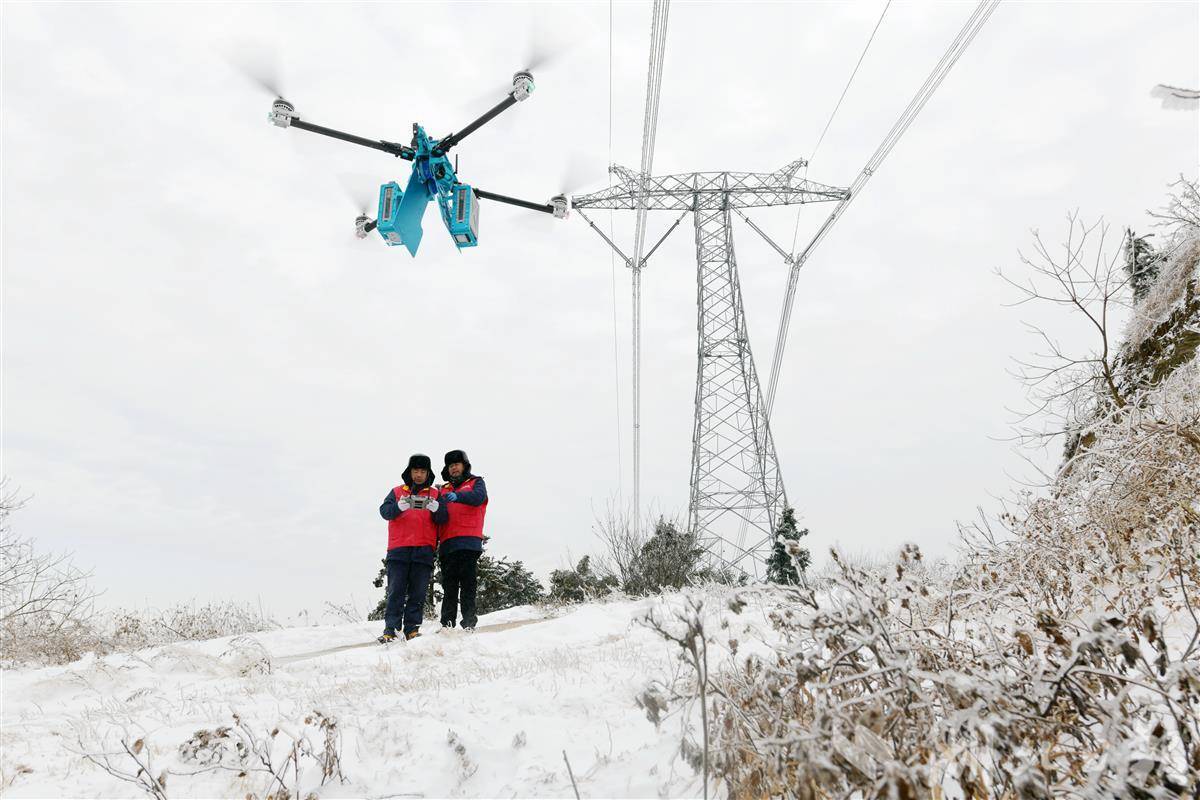 1月21日,在孝感大悟山区±800千伏陕北至武汉电力线上,国网湖北送变电公司运维人员采用智能飞行除冰机器人开展清除覆冰作业。