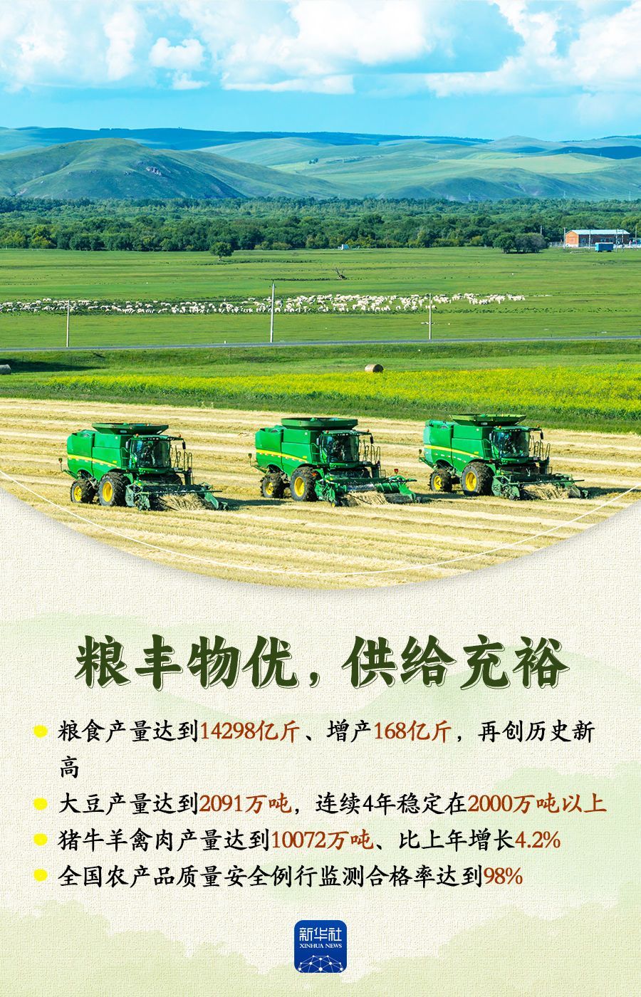 国务院新闻办公室22日举行新闻发布会,农业农村部相关负责人介绍加快农业农村现代化,扎实推进乡村全面振兴有关情况。2025年,我国农业农村发展保持稳中有进、稳中向好的势头,为推动经济社会高质量发展提供了基础支撑。跟随这组海报,一起来看。