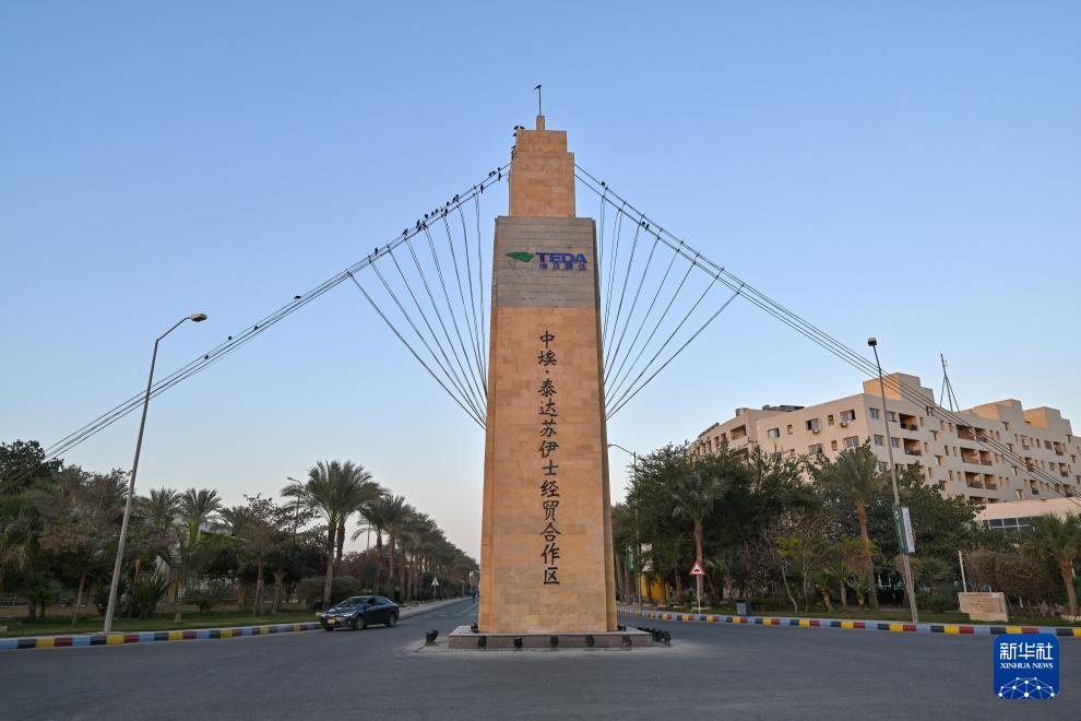 在埃及红海之滨的城市苏赫奈泉,中埃·泰达苏伊士经贸合作区(泰达合作区)内厂房林立,满载集装箱的卡车穿梭而过。苏赫奈泉,阿拉伯语意为“热泉”;如今,中埃经贸合作正如同涌泉,热气腾腾。