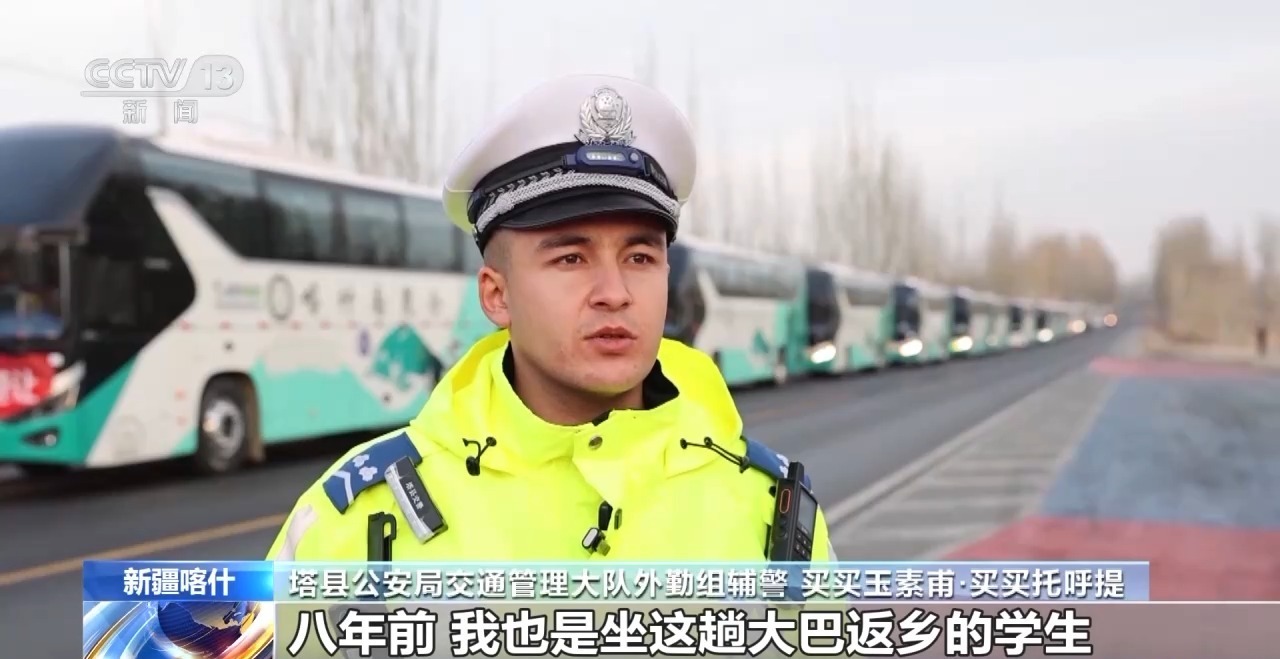 塔县公安局交通管理大队外勤组辅警 买买玉素甫·买买托呼提:八年前,我也是坐这趟大巴返乡的学生,那时有警察护送,我们很安心,现在我成了护航者,才懂这份责任的重量。确保每个孩子都平安到家,不仅是我们的职责使命,更是对前辈精神的传承。
