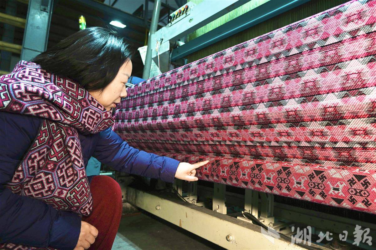 1月22日,恩施州西兰卡普生产基地内,传承人田若兰正在改良织机前查看双面织锦生产情况。