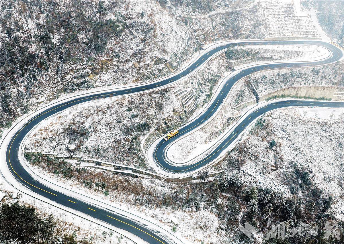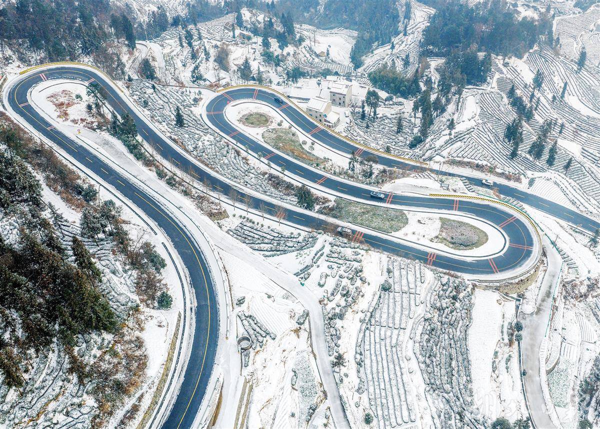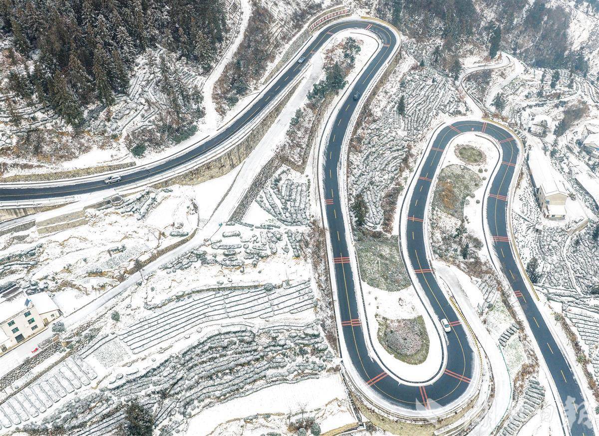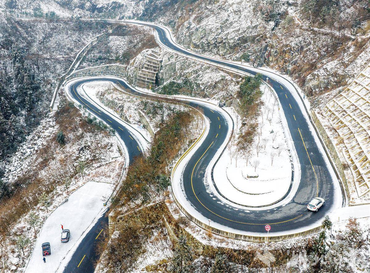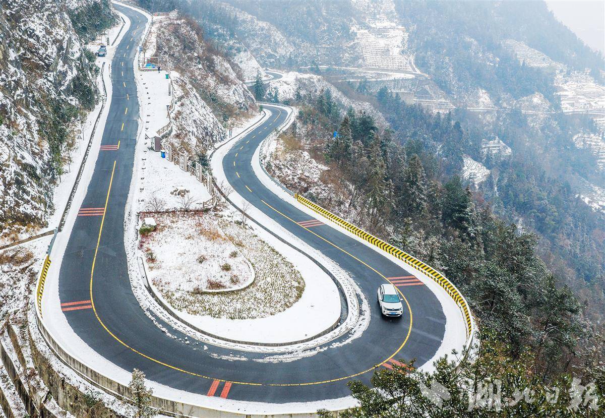 1月22日,车辆行驶在秭归县茅坪镇盘山公路上。雪后初霁,秭归县的盘山公路斗折蛇行,与银装素裹的大地相映成趣。近年来,当地积极推进“四好”农村公路建设,极大方便了山区群众出行,有效助力了乡村产业振兴。(视界网 王罡 摄)