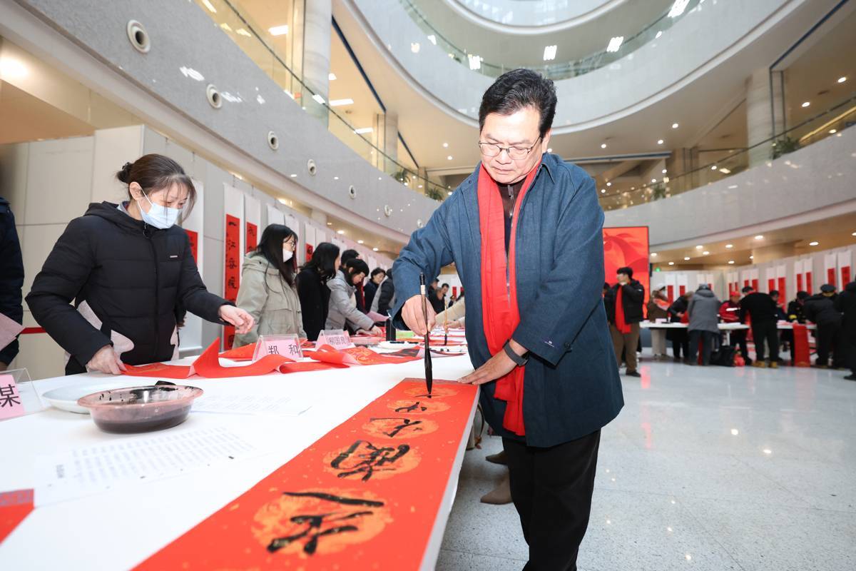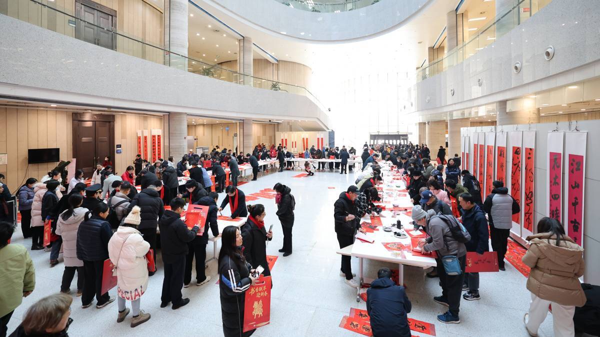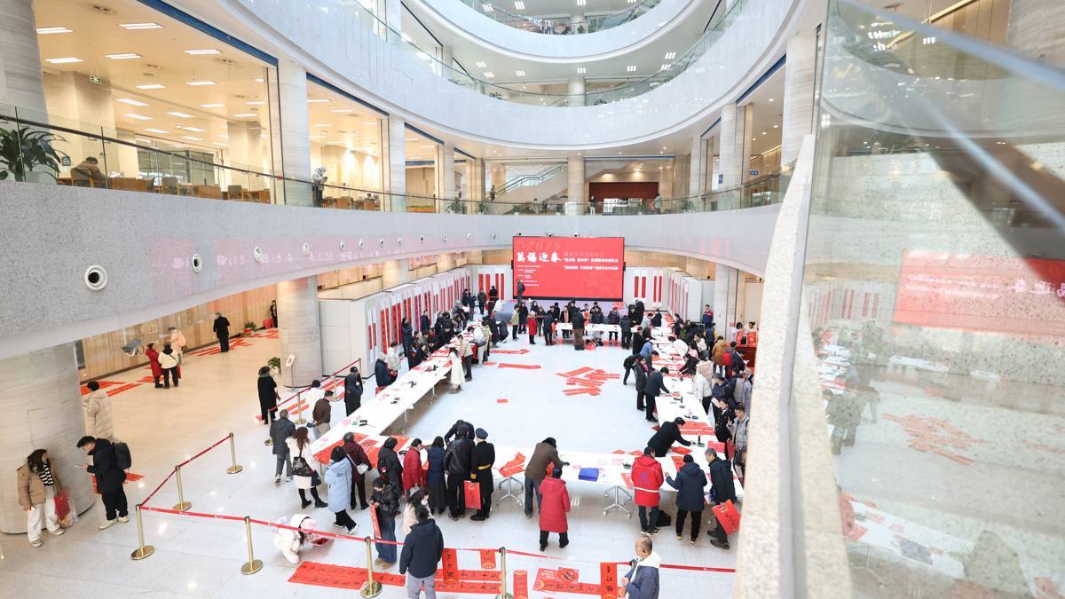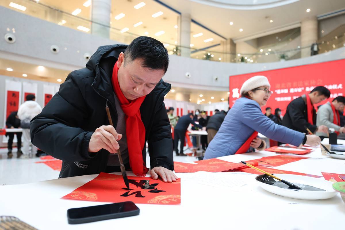 2026年1月23日,第八届书香联萃迎新春——书法名家写春联送万“福”惠民活动在湖北省图书馆1楼东庭热闹上演,来自湖北省书法家协会的40余位书法艺术家汇聚一堂,为市民免费写送春联福字,吸引大批市民前来体验,感受浓浓的年味。书法名家们挥毫泼墨,为读者们书写春联和福字,愿以一方红纸、数行墨香,落成门楣间最温暖的新岁祝祷。(湖北日报全媒记者 何宇欣 摄)