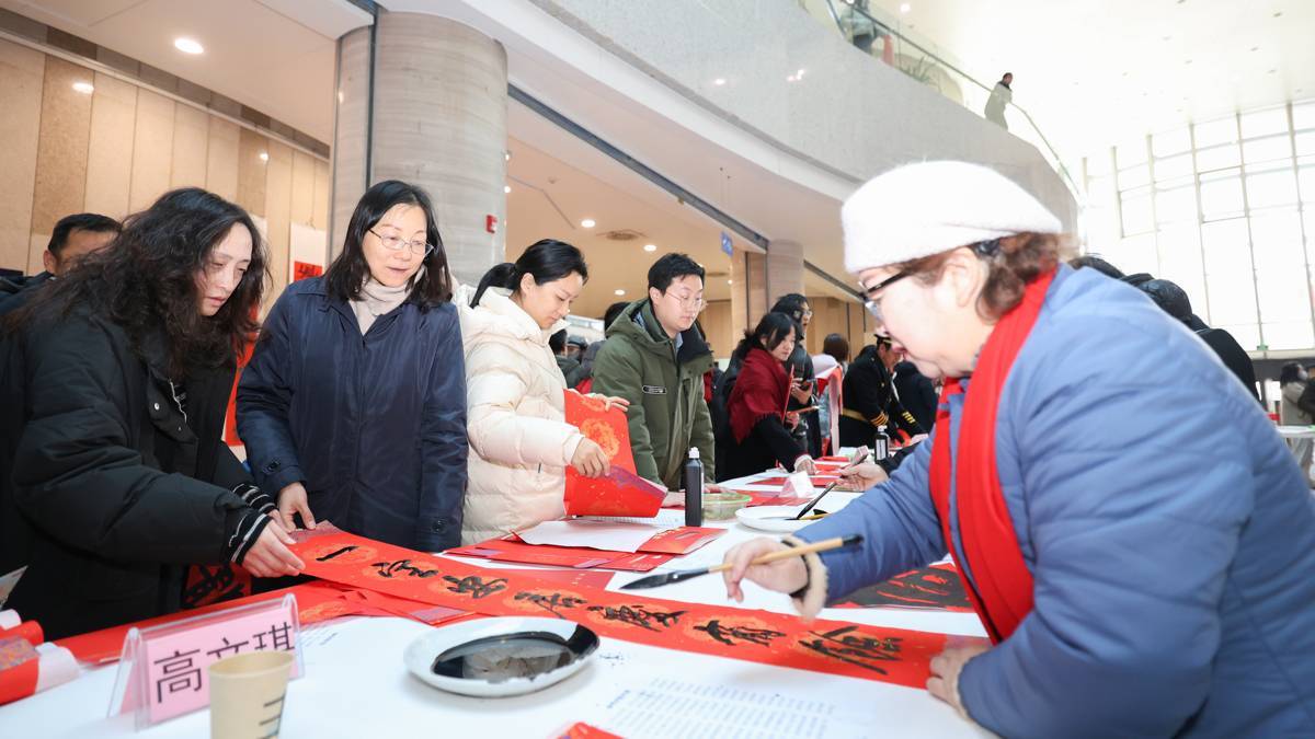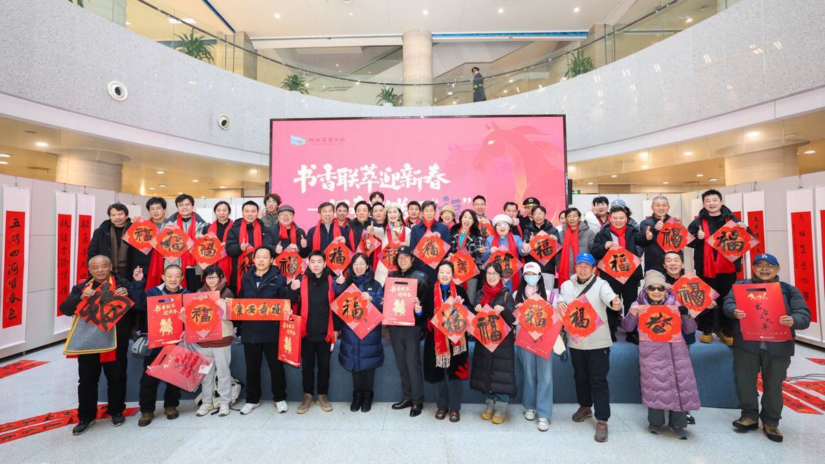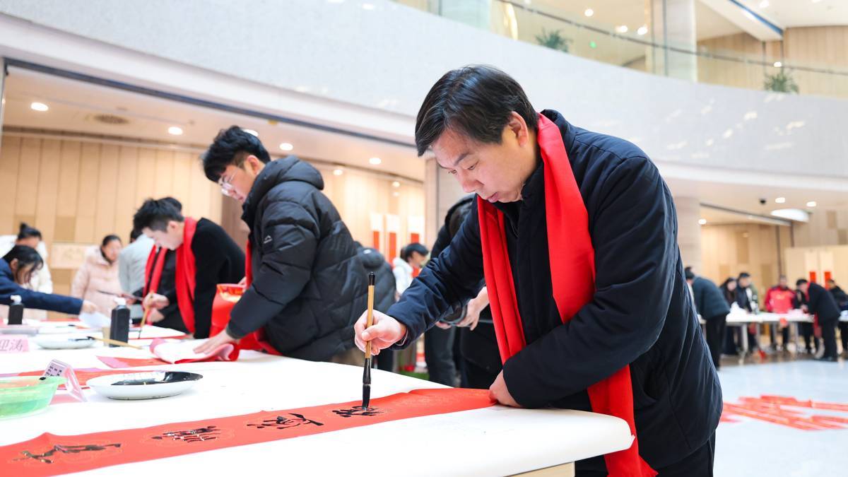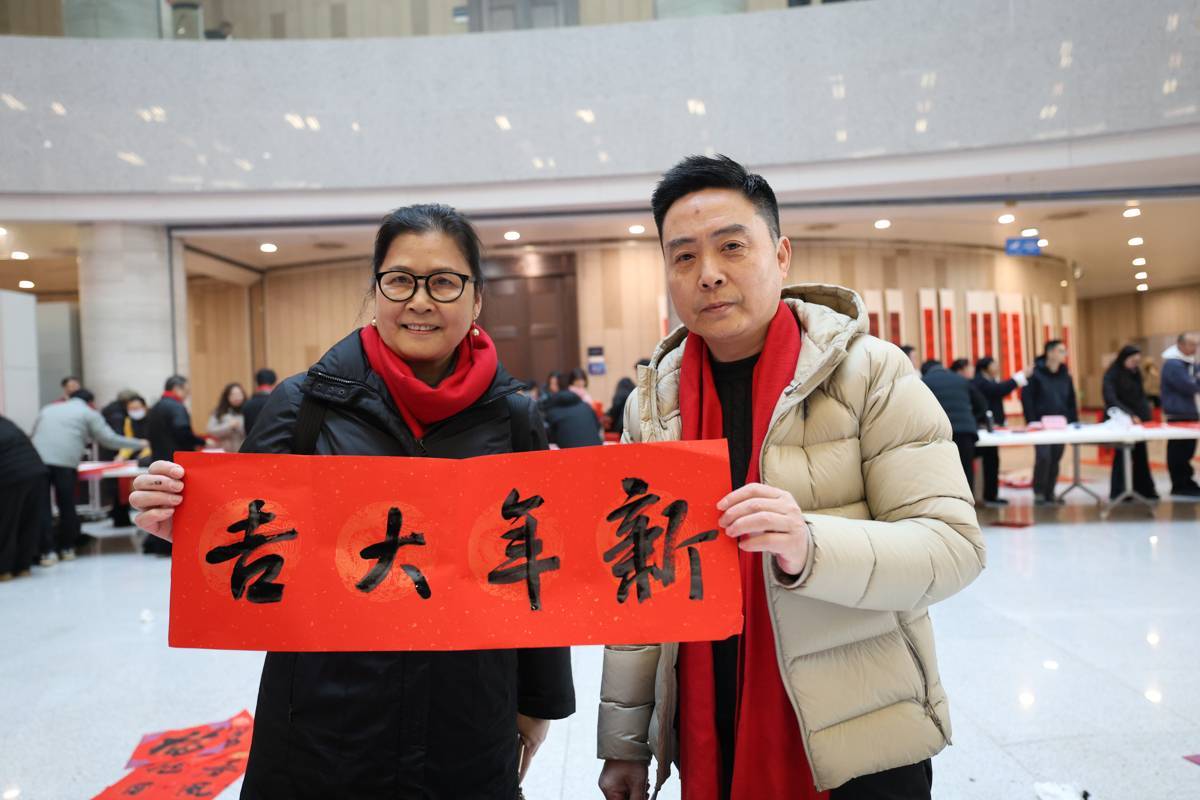 2026年1月23日,第八届书香联萃迎新春——书法名家写春联送万“福”惠民活动在湖北省图书馆1楼东庭热闹上演,来自湖北省书法家协会的40余位书法艺术家汇聚一堂,为市民免费写送春联福字,吸引大批市民前来体验,感受浓浓的年味。书法名家们挥毫泼墨,为读者们书写春联和福字,愿以一方红纸、数行墨香,落成门楣间最温暖的新岁祝祷。(湖北日报全媒记者 何宇欣 摄)