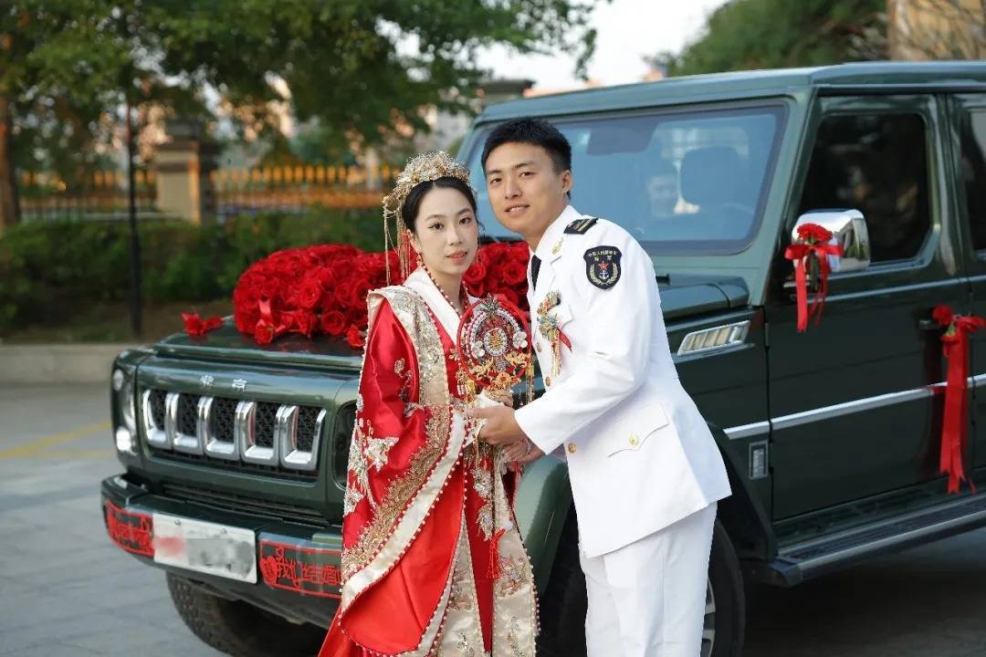 活动当天,新郎们身着军装,英姿飒爽地通过接亲游戏的考验后,顺利将新娘们接上军车,向着十里军港幸福出发。在战友们的欢呼声中,一对对新人携手走上幸福通道,登上战舰甲板,开启充满蓝色回忆的婚礼仪式。