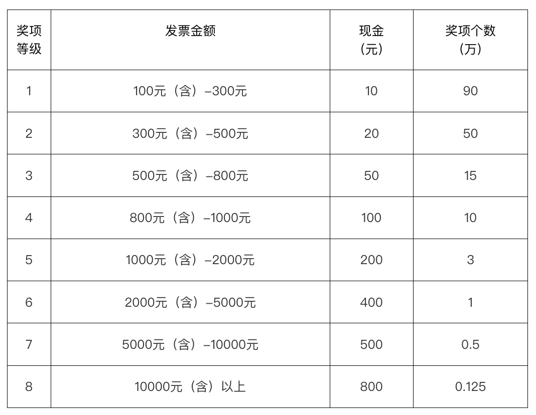(三)奖项设置。按发票金额共设置8个等级奖项。奖项通过“云闪付”APP及时兑付中奖者银行卡账户。具体分配如下: