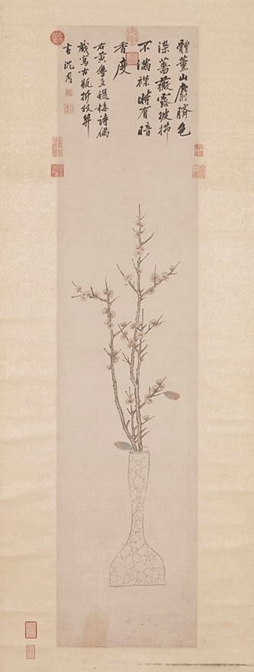 而数百年后,明代沈周在《瓶中蜡梅轴》中,则呈现出另一种美学追求:以书入画,枝如屈铁,全凭水墨氤氲与笔法节奏传达梅之清韵。画幅上方,沈周以行书记录了黄庭坚的咏蜡梅诗:“体薰山麝脐,色染蔷薇露。披拂不满襟,时有暗香度。”诗画呼应,香气似已破纸而出,并自题“偶戏写古瓶折枝”,尽显文人游戏笔墨、直抒心性的洒脱。