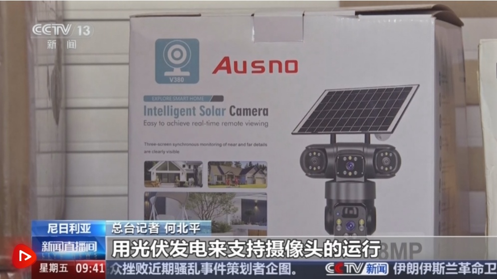 这个新能源产品可以说是非常具有非洲特色,它的上面是两片光伏板,下面是两个可以调整角度的摄像头,用光伏发电来支持摄像头的运行,还有把路灯、摄像头和光伏结合在一起的。
