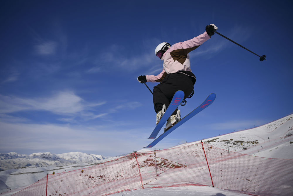 雪友在新疆阿勒泰将军山滑雪公园飞越跳台。新华社记者 胡虎虎 摄