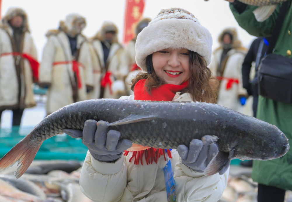 1月18日,在博斯腾湖冰面上,游客手捧刚打捞上来的博斯腾湖鱼。新华社发(年磊摄)