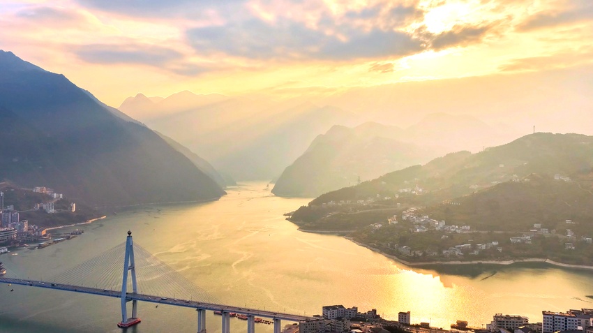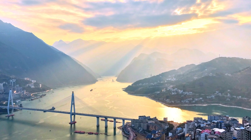 冬日的长江巴东段,江水碧绿,两岸青山在暮色中更显苍劲。当夕阳西下,金色的霞光穿透云层,洒在江面与桥身之上。巴东长江大桥的斜拉索结构在光影中显得格外雄伟而柔美,如平湖般的江面,船如流水。