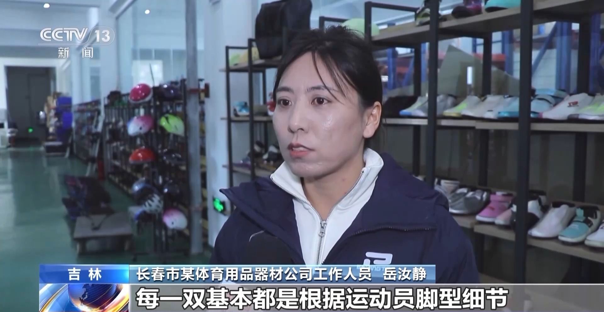 长春市某体育用品器材公司工作人员 岳汝静:每一双都是根据运动员脚型细节定制化打造,高度贴合鞋身,解决了亚洲运动员脚型与进口鞋不匹配的问题。