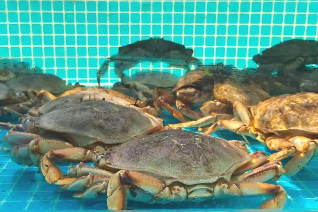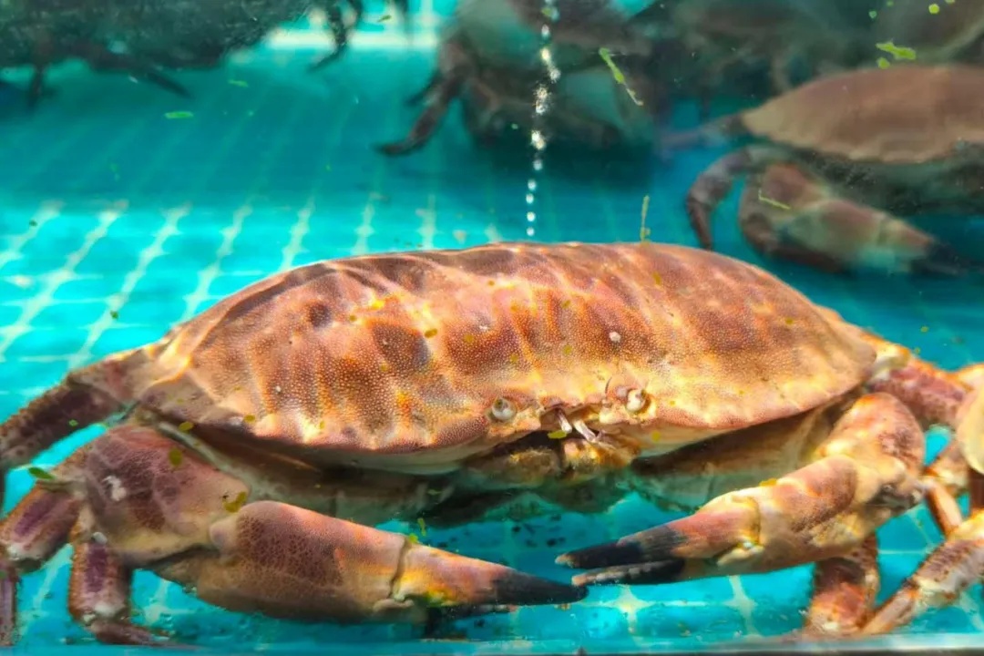 一旁的松叶蟹则以肉质细腻、丝丝分明著称。面包蟹则膏黄饱满,标签上贴心备注“推荐避风塘炒制。