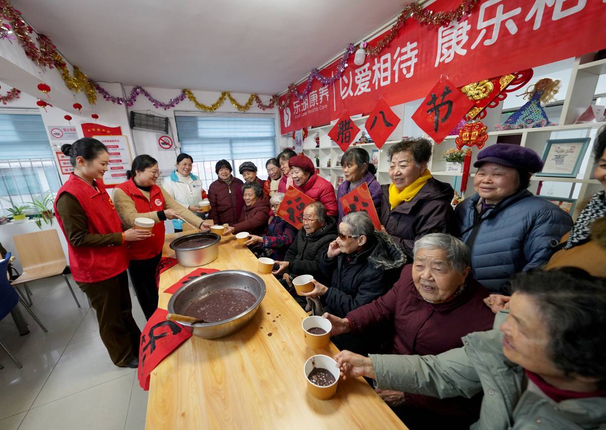 1月25日,志愿者们和社区老人一起喝腊八粥,迎腊八节。