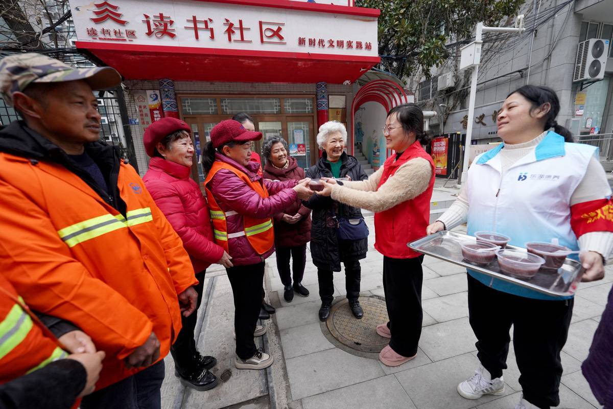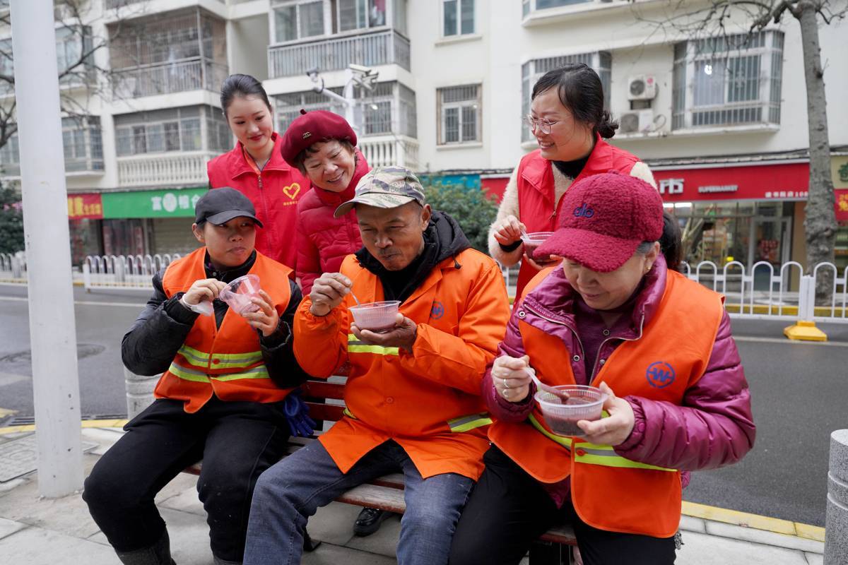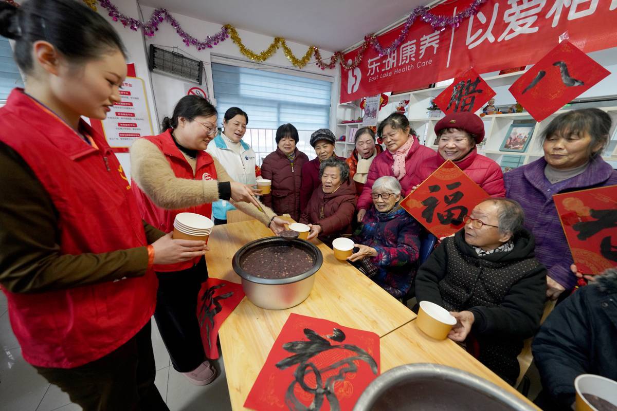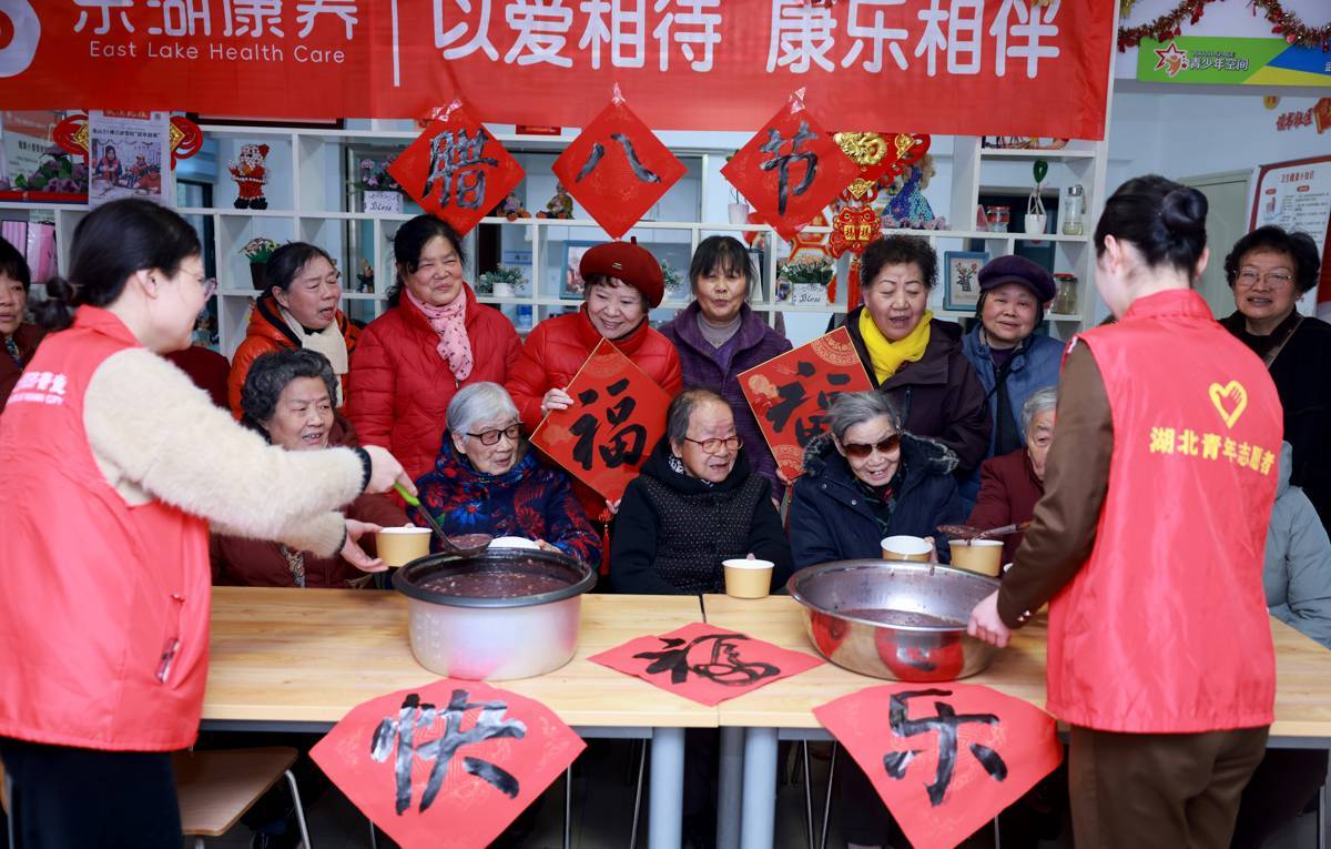 1月25日,志愿者们为老人、环卫工盛上热腾腾的腊八粥。农历腊八节来临之际,武汉市黄鹤楼街道读书社区东湖康养老年人活动中心和武汉客运段志愿者组织开展“情暖腊八·邻里同心”主题活动,邀请辖区老年居民、环卫工人及困难群众欢聚一堂,共品腊八粥,共话邻里情,让这个寒冷的冬日充满暖意与温情。(湖北日报全媒记者 魏铼 通讯员 聂家欣 王婷婷 摄)