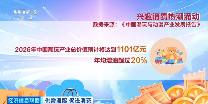 根据《中国潮玩与动漫产业发展报告》数据显示,2026年,中国潮玩产业总价值预计将达到1101亿元,年均增速超过20%;文博衍生品市场规模也连续多年稳步增长。从潮玩小店的抢购热潮,到博物馆的爆款文创,兴趣消费正在以多元的形态融入大众生活,为消费市场注入新动能。