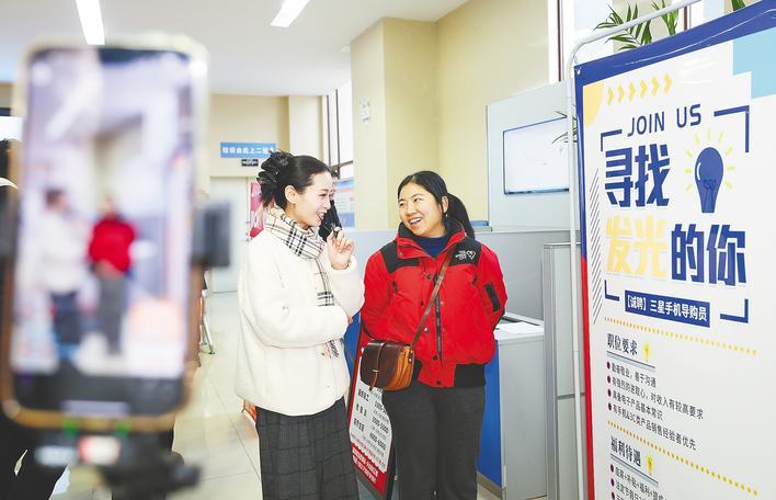 临近春节,为助力广大返乡人员及求职者实现家门口就业,襄阳市襄城区举办“春风行动”专场招聘会。图为1月23日,工作人员(左)在招聘会现场开展线上“直播带岗”。(视界网 杨东 摄)