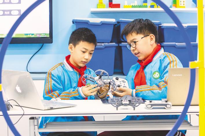 省人大代表积极建言,推进教育均衡发展。图为襄阳市大庆路小学学生在学习无人机编程。 (视界网 李旭晖 摄)