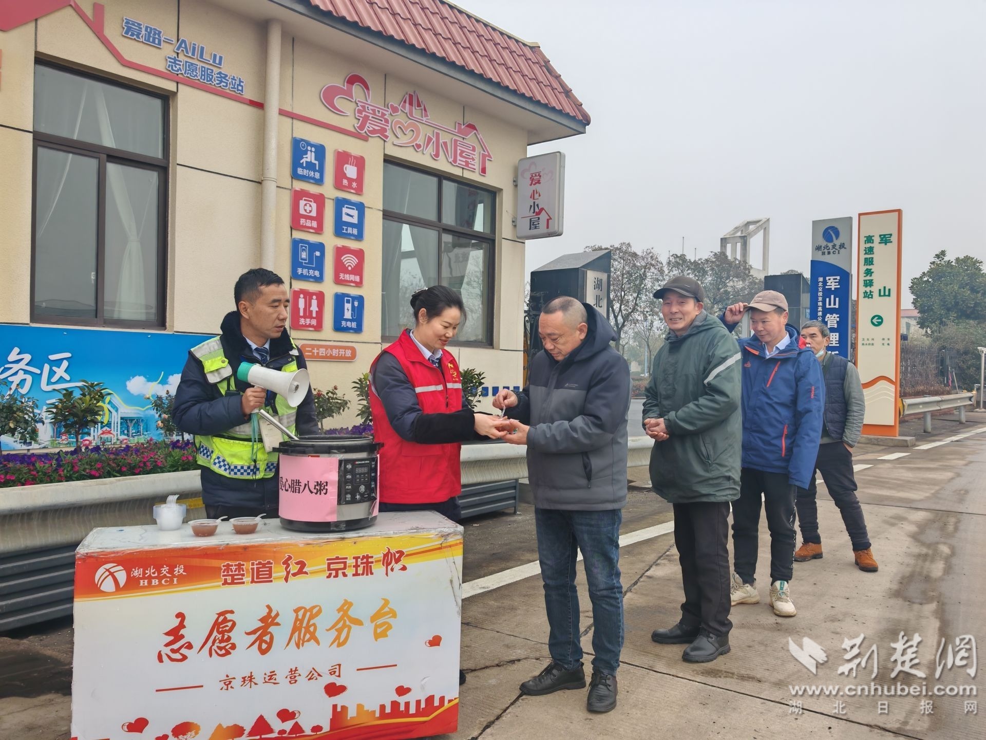 荆楚网(湖北日报网)讯(通讯员陈文 朱芳)岁至腊八,寒意渐浓。1月26日,农历腊八节当天,湖北交投京珠运营公司“爱路-AiLu”志愿服务队在辖区各高速服务驿站开展志愿服务活动,以一碗碗热气腾腾的腊八粥,为奔波在京珠高速上的万千司乘送上冬日暖意与节日祝福,用实际行动诠释“微笑京珠、情满荆楚”的服务理念。