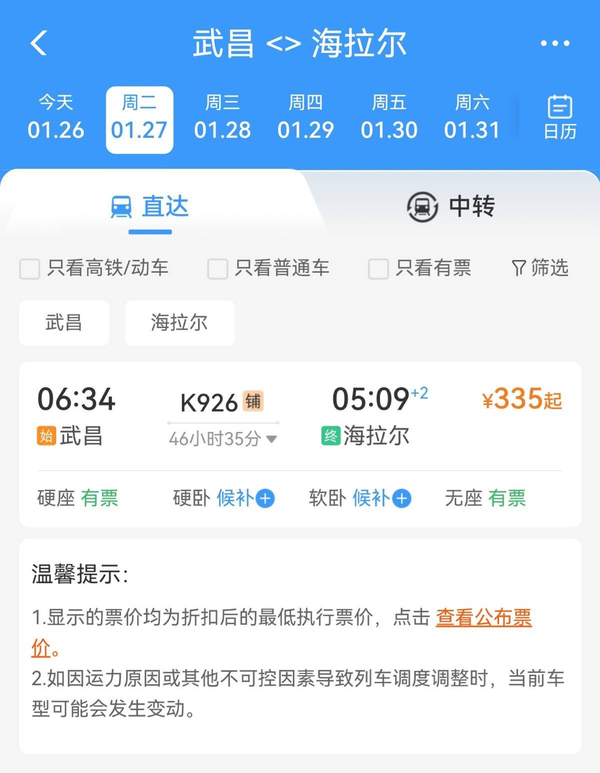 1月26日,全国铁路实施新列车运行图,武汉铁路同步调整。其中,一趟从武昌火车站始发的列车K926,因其穿越中国南北的漫长旅程和超值票价,引发关注。