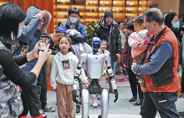People interact with a robot from Unitree Robotics at the company's first offline store in Beijing on Dec 31. ZHANG XIANGYI/CHINA NEWS SERVICE