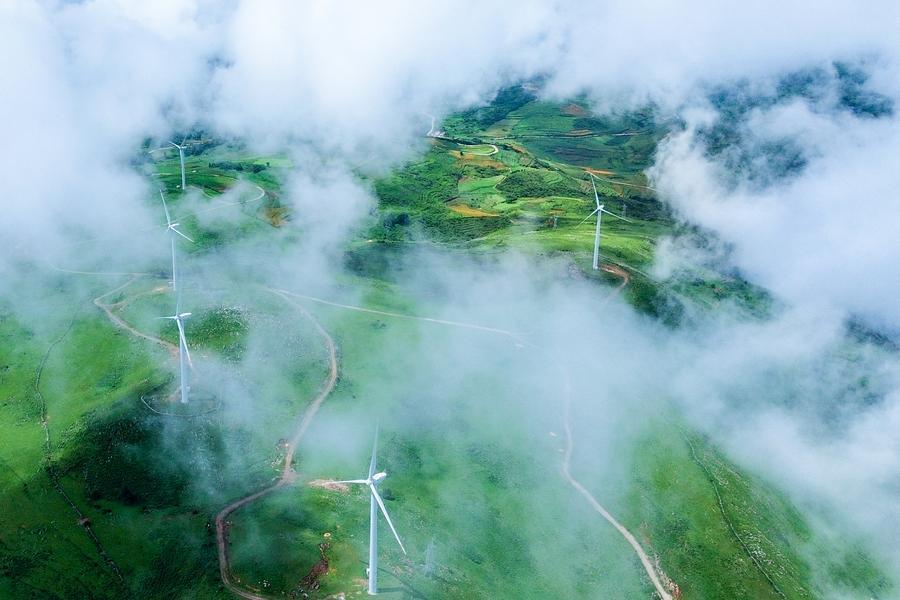 An aerial drone photo taken on July 3, 2025 shows the wind turbines in Shuanglong Town in the Yi-Hui-Miao Autonomous County of Weining, southwest China's Guizhou Province. (Xinhua/Tao Liang)