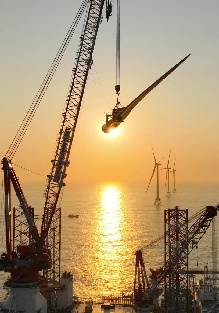 A drone photo taken on Jan. 13, 2026 shows one of the turbine blades being hoisted at the construction site of a 20-megawatt offshore wind turbine unit in the coastal waters of southeast China's Fujian Province. (Xinhua/Lin Shanchuan)■