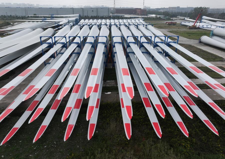 A drone photo taken on Nov. 2, 2024 shows wind turbine blades at a wind power equipment company in Rudong County of Nantong City, east China's Jiangsu Province. (Xinhua/Song Yanhua)